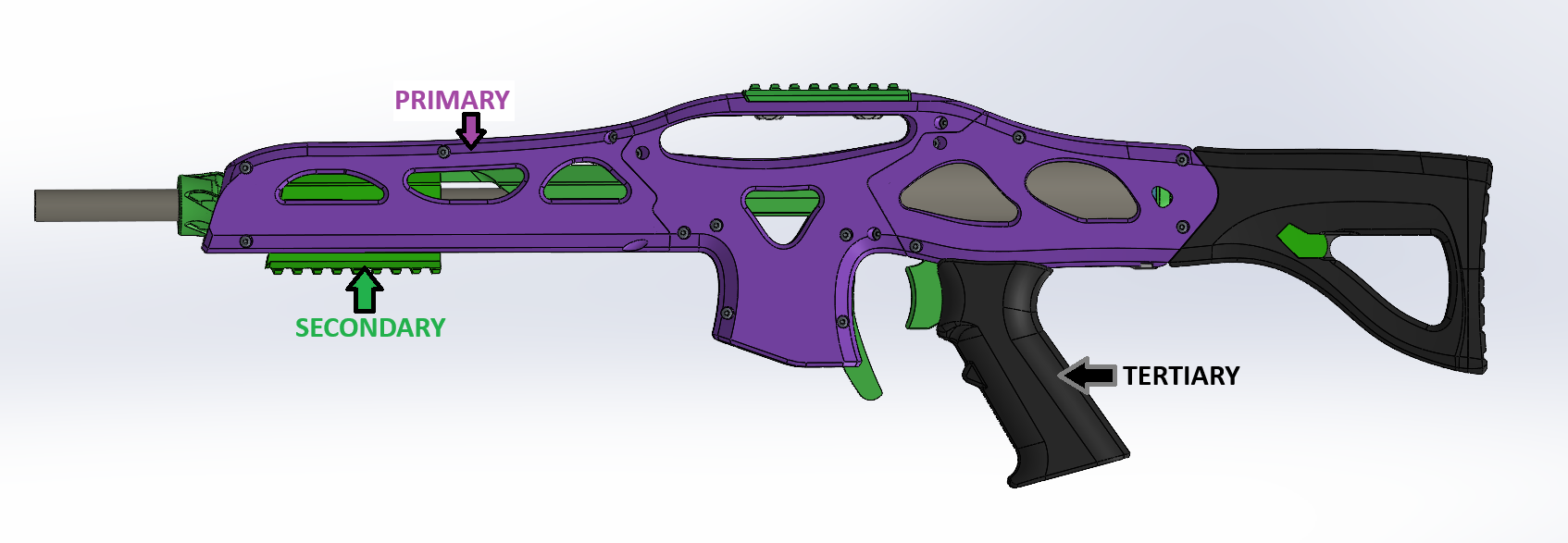 Ontos is a tryhard primary for the filthy casual, easily hitting 170-250fps. It's low-hardware, low-budget, low-effort, and low-weight - tailor made for, and by, the lazy and the poor. Designed around only one screw size and 9 hardware items total, the BOM is a third the length of comparable springers such as the SBL and the Alchemist. For this, you get the following: