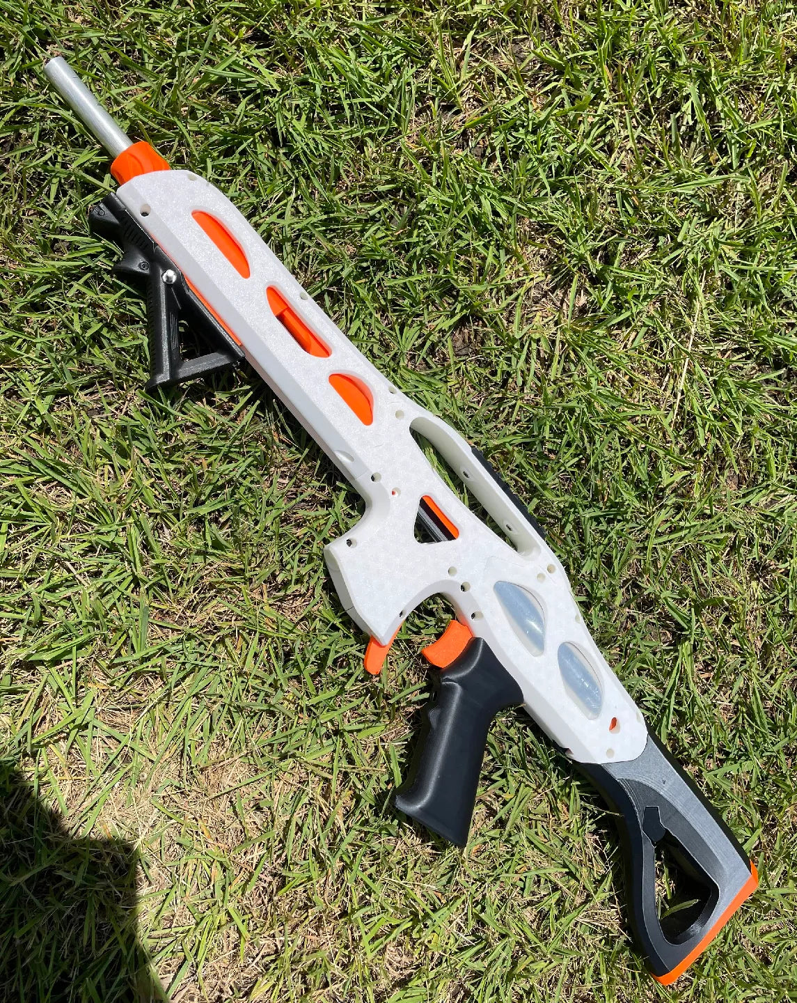 Lightweight, Self-tensioning frame - With a combination of canted screw bores, unconventional joinery techniques, and a healthy dose of keying features, the frame panels are preloaded against each other without the need for a bar tensioner. The blaster is remarkably rigid despite not using flat bar, and much lighter than designs that do.